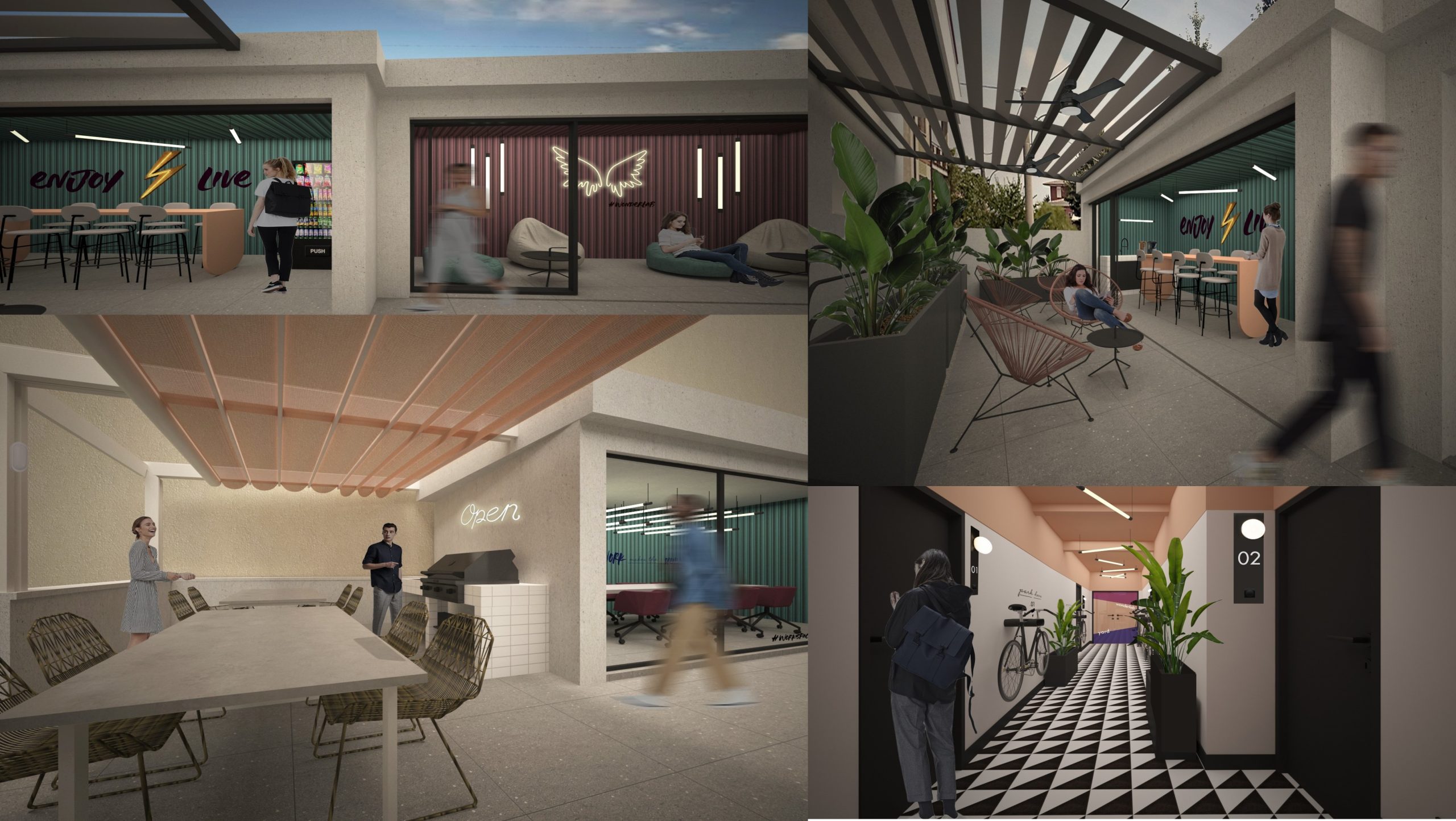 הבניין הינו שיתופי (Co-Living) – המטרה היא ליצור חיי קהילה עם עיצוב עכשווי לסטודנטים המתגוררים בו. החללים מרוהטים במלואם ומזמינים את דיירי הבניין ליצור אינטראקציה חברתית ותחושה של משפחה. חדרי הלימוד בגג מקדמים חוויה לימודית וחברתית תוך הקמת קהילה מגוונות. המרחבים הציבוריים ישמשו את הדיירים ובניהם: פינות ישיבה, מכבסה, אזורי לימוד משותפים, מועדון ועוד. הדירות מאובזרות ומרוהטות כולל אינטרנט ואפילו Netflix.